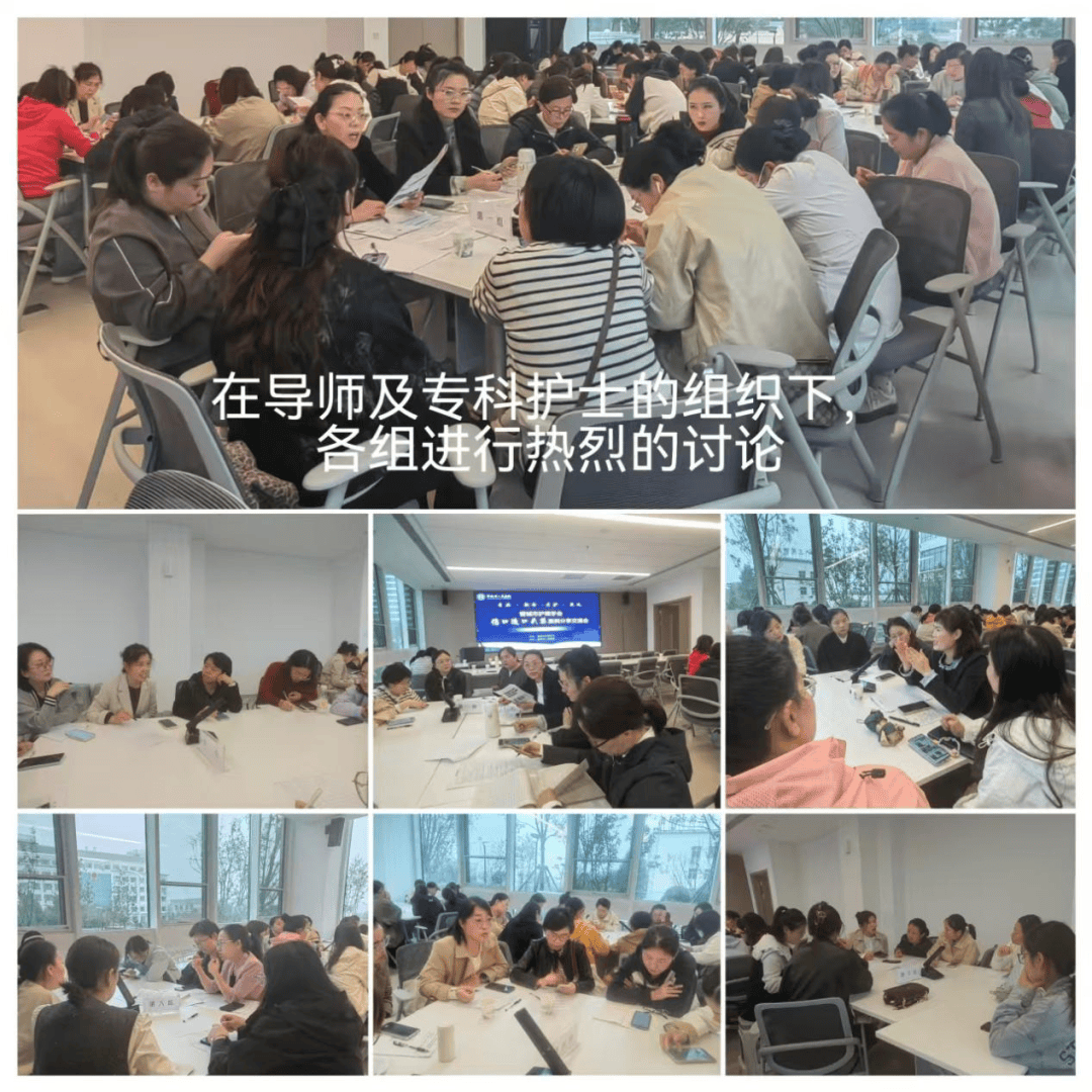 小组案例讨论环节,8个讨论小组在导师及专科护士的引导下,围绕分组案例中的难点问题、护理方案优化方向、临床经验总结等展开热烈探讨。大家结合自身临床实践踊跃发言,既分享了成功护理的“实战技巧”,也坦诚提出了工作中遇到的困惑,通过思维碰撞形成了多个可落地的护理优化思路,真正实现“从案例中来,到临床中去”。