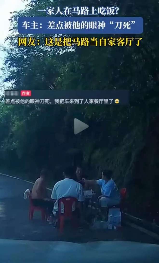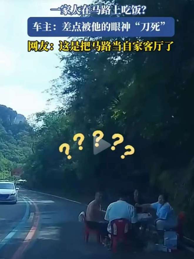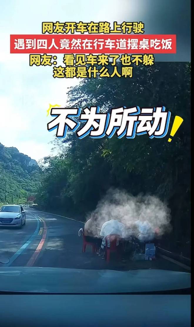 根据《道路交通安全法》,行人不得在车行道内坐卧、停留、嬉闹。这四位大哥大姐直接搁马路中央开饭,属严重违法先不说,还把自己和他人置于极度危险的境地。