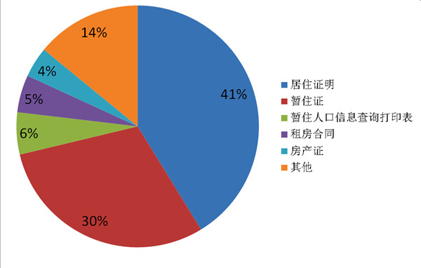 通过统计,在选取的202份裁定书中,当事人双方总共向法院提交了320份证明材料。其中居住证明和暂住证最多,分别是132份和96份。其他的证明材料还包括暂住人口信息查询打印表、租房合同等。所提交证明材料的组成情况如下表所示: