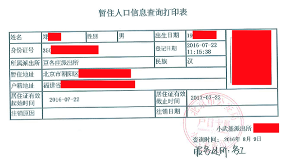 暂住证一般保存在持证人手中,如果想要证明对方当事人的经常居住地,应该怎么办呢?根据北京市公安局颁布的《对外提供查询人口信息户籍服务工作规范》相关规定,当事人可以委托律师前往派出所对北京市户籍人口或在北京市公安机关办理过暂住证件的暂住人口进行信息查询。通过查询就能知道被查询人的居住或暂住信息,从而确定其经常居住地。查询结果如下表所示。