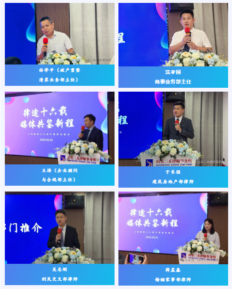 为让媒体更深入了解三禾的专业服务能力,律所各专业化部门主任及律师依次上台,围绕核心业务领域进行详细介绍。“分工明确、术业专攻” 的专业特色,也展现了 “协同作战、高效联动” 的团队优势,让在场媒体对三禾的法律服务体系有了全面且深入的认识。